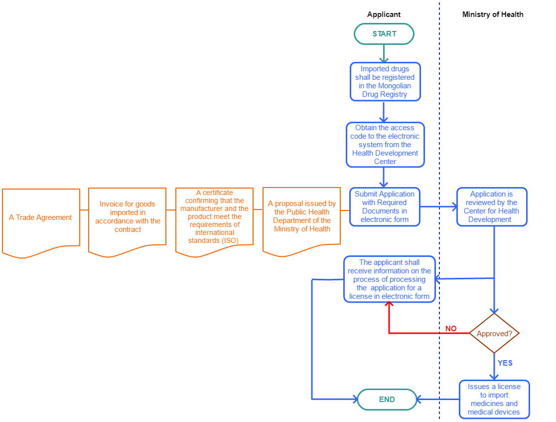 NOTE; 1. The Licensor shall have the right to inspect, verify, and issue an opinion on the applicant's documents by the relevant authority, if necessary. In this case, the period shall be extended until the conclusion of the relevant authority and the applicant shall be responsible for the costs incurred in this connection. 2. The license shall be issued for a period of up to six months. 3. It is prohibited to transfer, sell, gift, or pledge the license 4. If a request is made stating the reasons for making an amendment during the term of the license, the amendment may be made based on the relevant documents 5. If it is necessary to change the type and quantity of drugs and medical devices specified in the license, a new application shall be submitted to obtain a license 6. Log in to the electronic system at the following web address and submit a license application and import report. http://www.moh.mn/licemed/