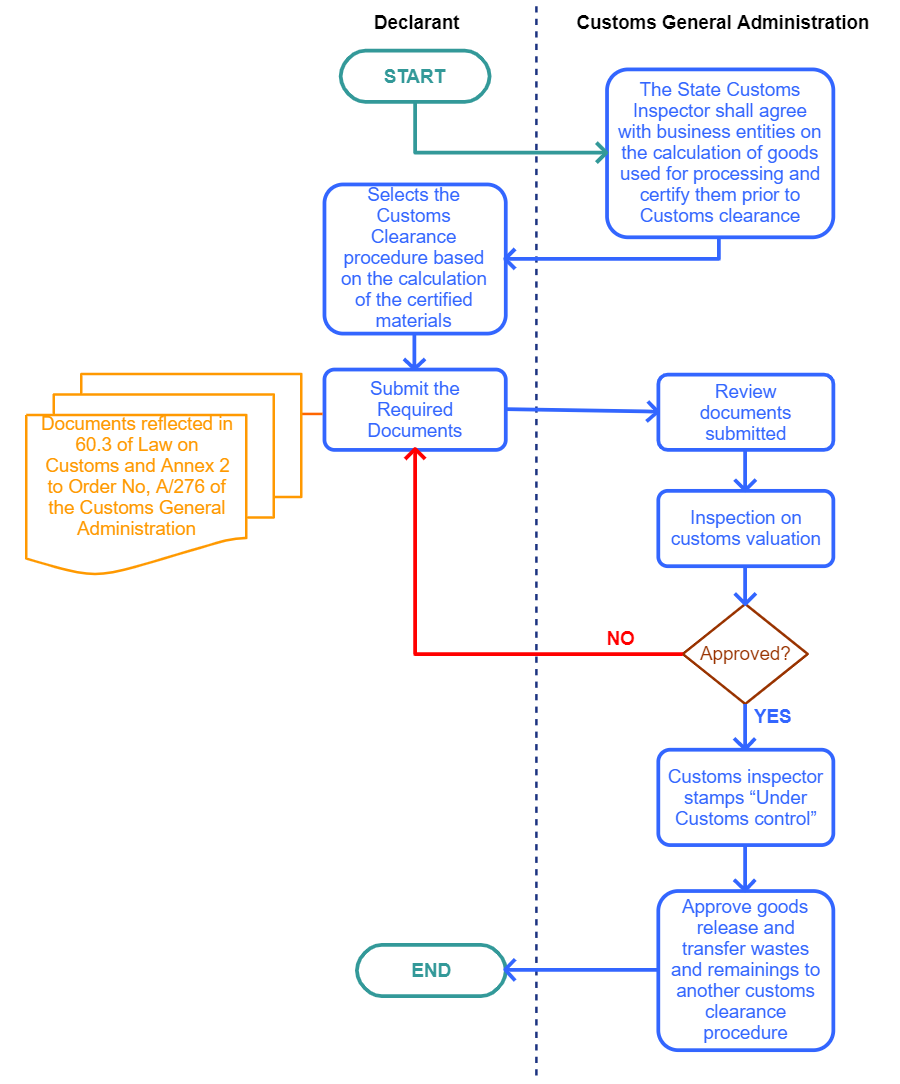 The State Customs Inspector in charge of Customs control and inspection shall agree with business entities and organizations on the calculation of goods used for processing and certify them prior to Customs clearance