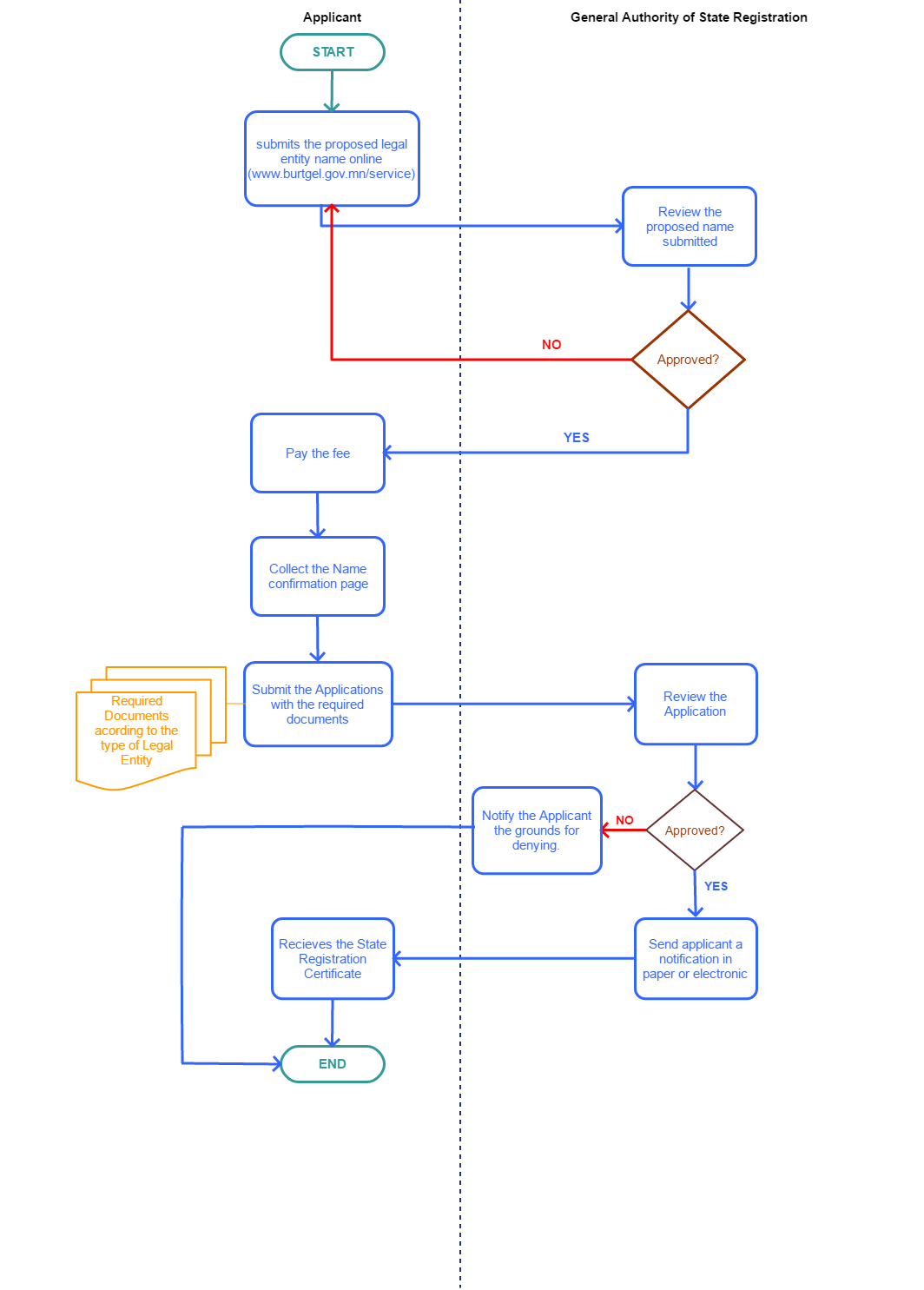 The Applicant submits the proposed legal entity name online (www.burtgel.gov.mn/service) to get confirmed by the General Authority of State Registration (if applicable)