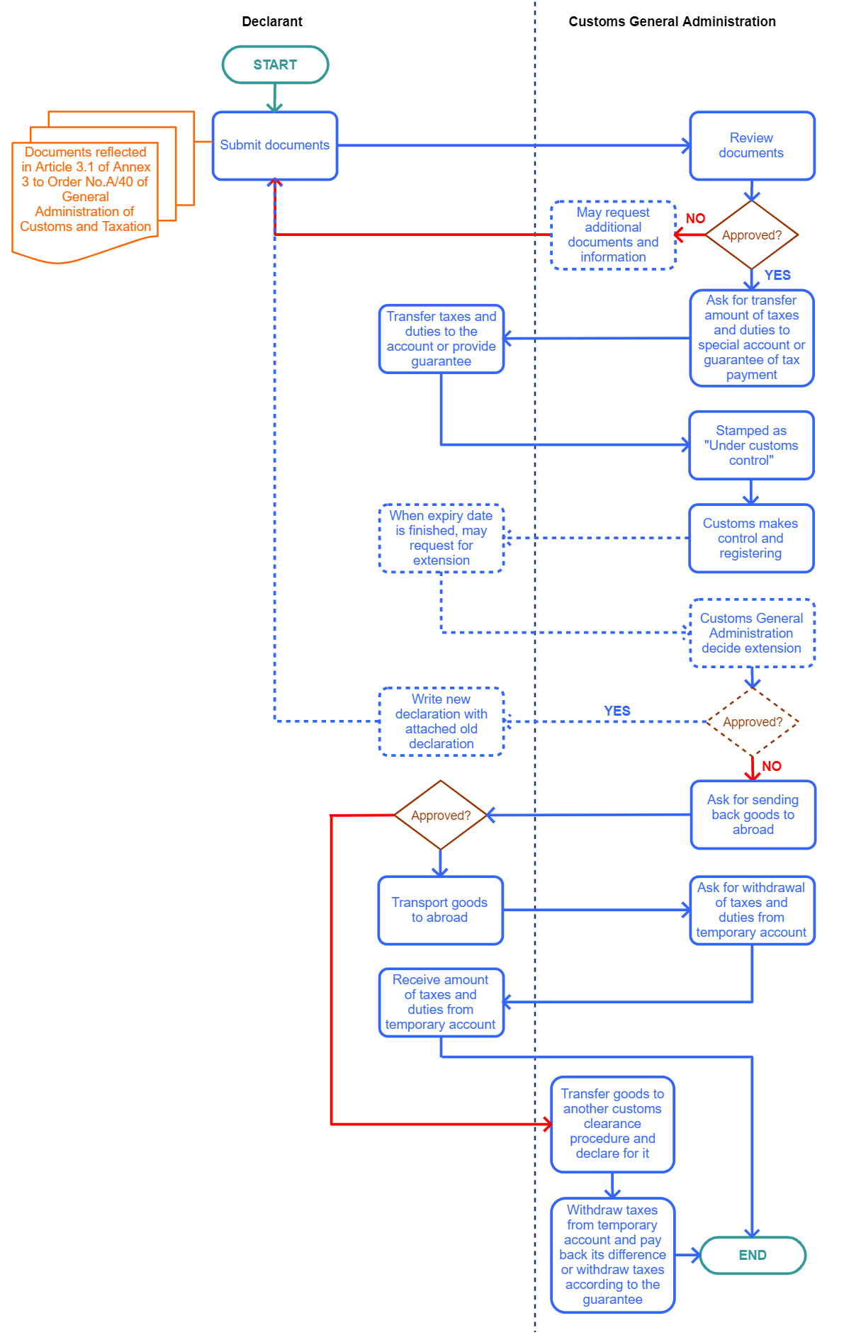 NOTE: 1. Goods reflected in Article 94 of the Law on Customs shall be declared according to this customs clearance procedure. 2. In order to declare goods under this clearance procedure, customs clearance codes should be used reflected in this procedure. 3. Customs will provide regular control and registration. Once date of temporary admission is finished, goods shall transfer to the customs clearance of goods for domestic consumption and customs levy taxes according to this procedure.